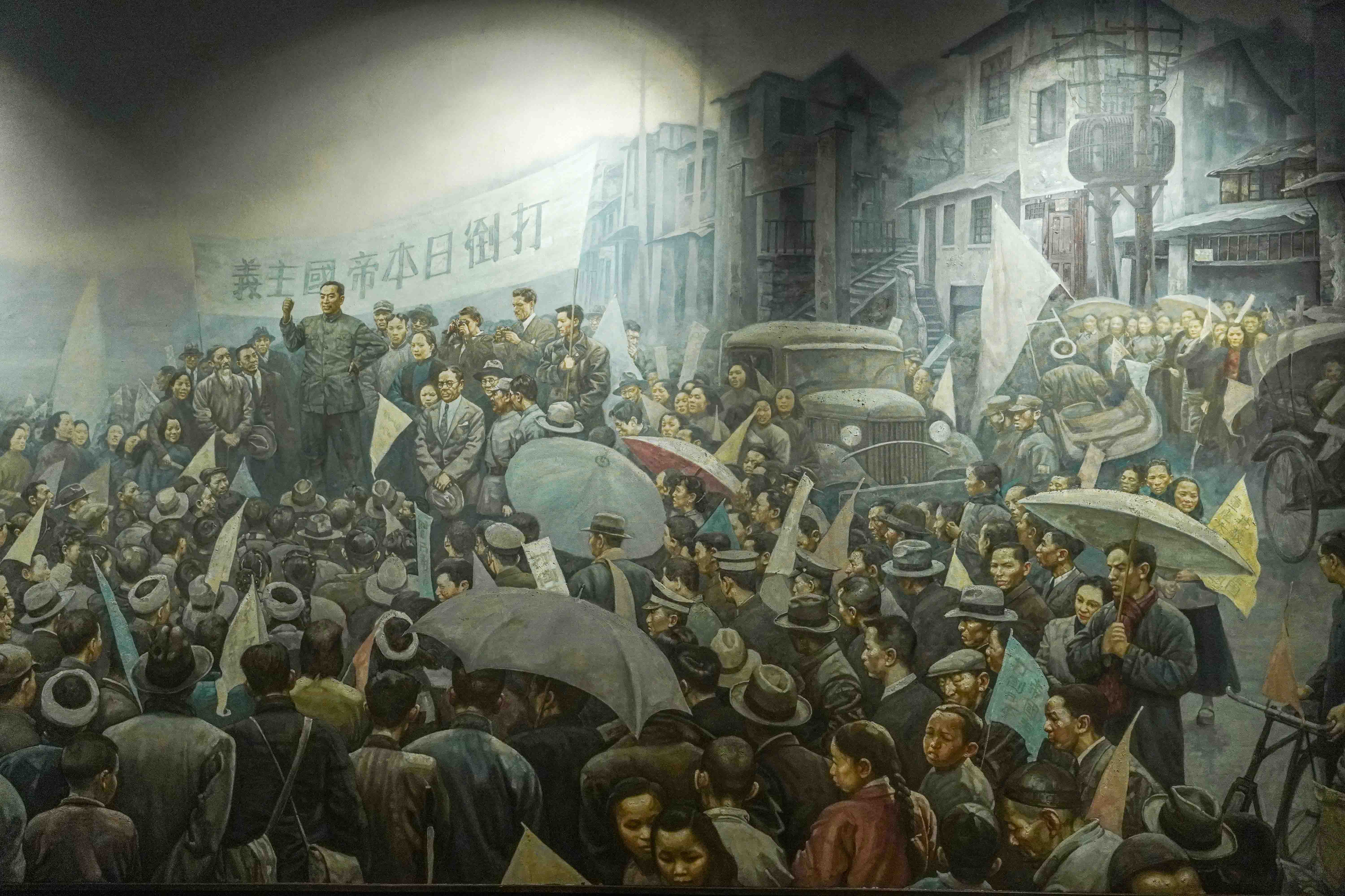 Artwork of Zhou Enlai speaking to a crowd in Chongqing (1940s), the Chinese Communist Party's Southern Bureau during the anti-Japanese war, Red Crag Revolutionary Museam, Chongqing, CN.