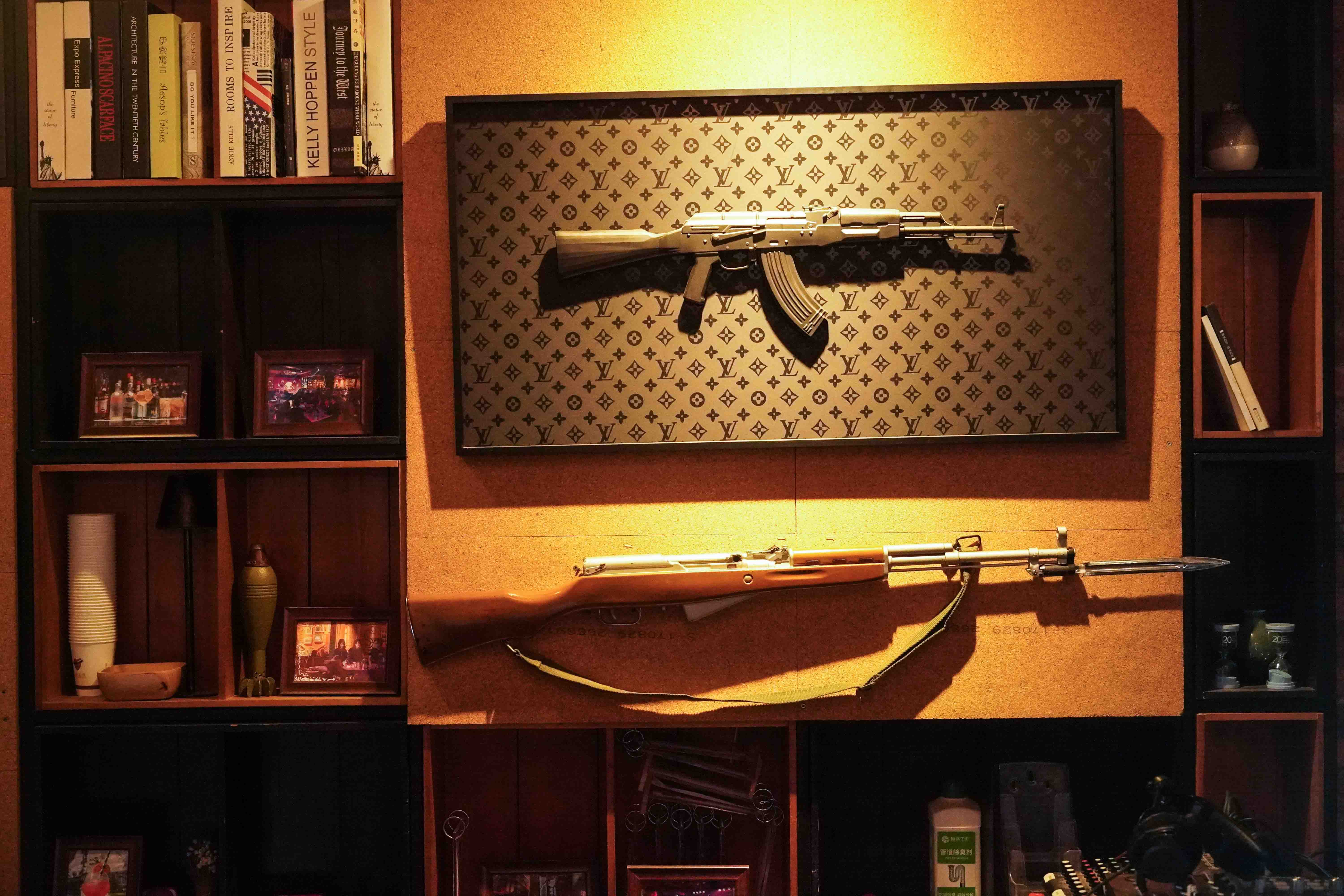 Kalashnikov and SKS Rifle, Hump Route Hostel, Kunming, CN.